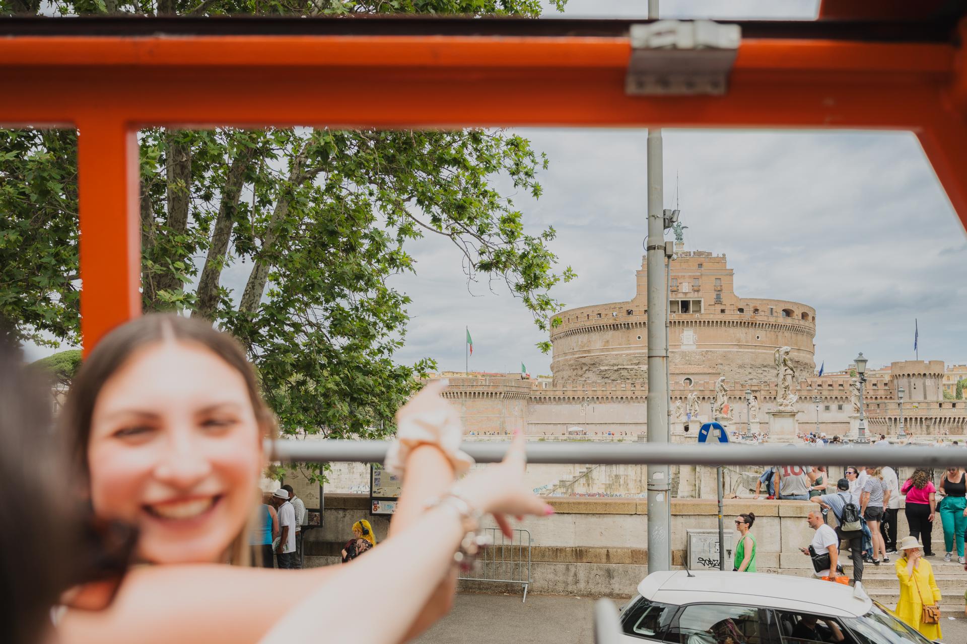 In Rom angekommen, ist der Hauptdarsteller des Tages der Touristenbus, ein sehr praktisches Mittel, um zu den wichtigsten Orten der italienischen Hauptstadt zu gelangen. Dank des Haltestellensystems können Sie ein- und aussteigen, wann immer Sie wollen, um Ihre Besichtigung nach Ihren Bedürfnissen zu gestalten, bequem die wichtigsten Sehenswürdigkeiten der Stadt anzusteuern und während der gesamten Fahrt einen hervorragenden Panoramablick zu genießen.